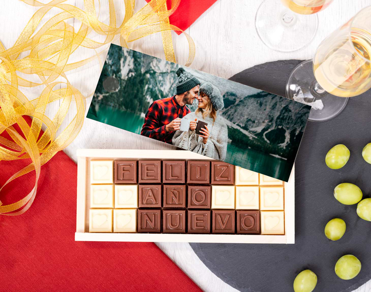 Felicita el año nuevo de la manera más original y dulce que existe. En una caja de madera (personalizada con la foto o el texto que quieras) encontrarás "Feliz año nuevo" escrito en 24 chocolatinas exquisitas. El chocolate está elaborado en exclusiva para nosotros por un maestro artesano, lo que garantiza un excelente sabor.