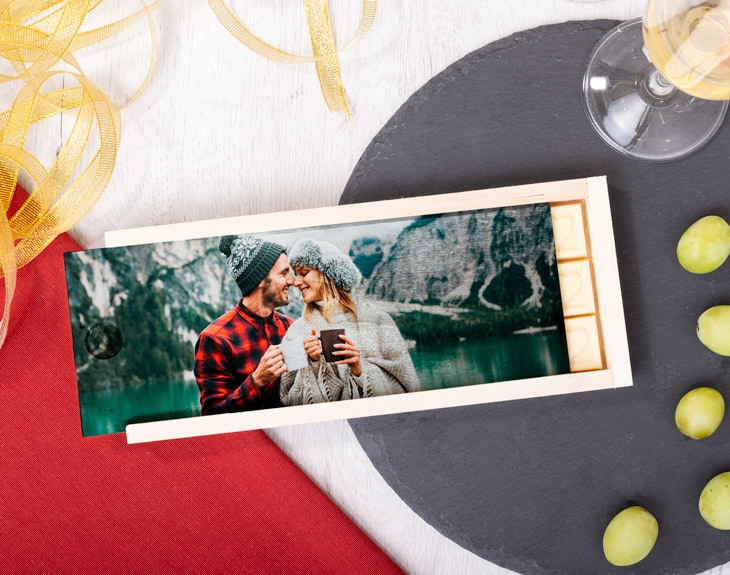 • Caja impresa con tu imagen. • 24 chocolatinas. • Tarjeta recordatoria. Importante: la caja está hecha en madera natural de abedul. Las maderas tienen vetas y estas pueden quedar reflejadas en la imagen.