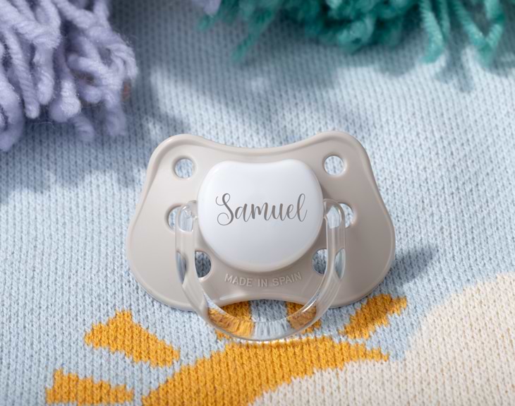 Después de unos meses duros de embarazo, por fin ha llegado el momento más esperado… ¡Tu familia tiene un nuevo miembro! Y es que un recién nacido siempre es un notición para todos. Si estás pensando en tener un detalle con los padres de la criatura, este es un regalo súper original. Se trata de nuestro chupete gris. Sin duda, es una preciosa forma de demostrar que te alegras y las ganas que tienes de achuchar al pequeño bebé. No solo es un regalo especial, sino que, además, es practico porque servirá para calmar los berrinches del recién nacido. Y lo más especial, es que es personalizable. Podrás escribir el nombre del recién nacido, ¡así todos sabrán su nombre! Y te preguntarás, ¿cómo personalizar este chupete gris? Lo primero lo primero es añadir el producto al carrito y entrar al área de personalización. En todo momento, podrás ver cómo queda el resultado en la vista previa de nuestra web. Nosotros nos encargamos de quede perfecto y listo para regalar. No se recomienda el uso de esterilizadores eléctricos con este producto.