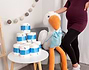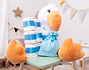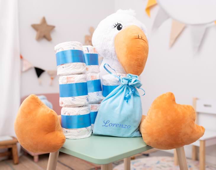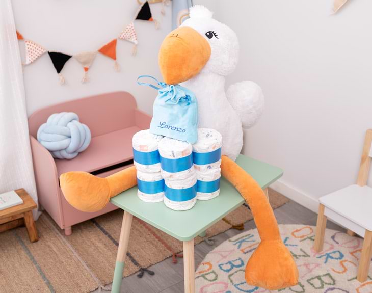 El peluche de cigüeña gigante es perfecto para sorprender al bebé de la familia. Si tus amigos acaban de tener un hijo, o vosotros mismos habéis sido padres, este regalo original es perfecto para darle muchísimo amor al pequeño. El peluche con forma de cigüeña de color azul mide 110 centímetros de alto y guarda en su saquito bordado 8 rollos de 7 pañales. Es un regalo perfecto para los bebés, pues además de darle mucho cariño y calor el peluche, tendrá siempre el culete limpito gracias a los pañales. Solo necesitamos un nombre para bordar el saquito.