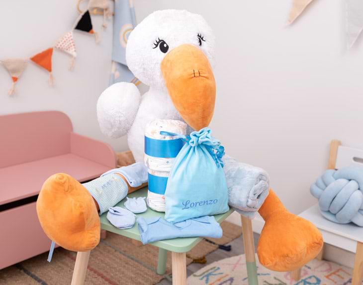 Nuestra cigüeña de peluche bordada es perfecta para dar una sorpresa a aquella familia que ha tenido un bebé súper mono y tierno. La cigüeña incluye en el saquito bordado todo lo necesario para vestir a tu niño y no pase nada de frío. Se trata de un regalo muy original para sorprender a la familia que acaba de tener un recién nacido en casa. ¡Es un regalazo muy completo! Solo necesitamos un nombre para bordar el saquito.