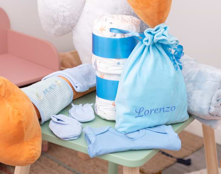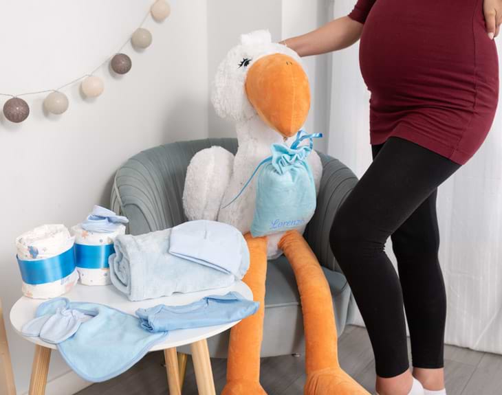 • Cigüeña gigante azul. • 1 Manta. • Rollo de 16 pañales. • 1 Gorrito. • 1 Babero. • 1 Body. • 2 Calcetines. • Tarjeta Recordatoria.