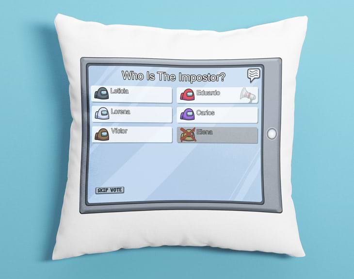 ¿Has pasado largas tardes y noches debatiendo quién es el impostor de la tripulación? ¿Te encanta jugar al Among Us para poder crear tu avatar y ponerte el nombre que quieras? Ahora podrás hacer eso mismo sin ni siquiera tener que encender el móvil. Qué mejor manera de hacer cómodamente las misiones o boicotear la nave que con la cabeza bien apoyada en tu propio cojín personalizado del juego que se ha hecho viral. Sorprende a tus amigos/as con el regalo original que estará deseando tener todo fan de Among Us. Podrás tener siempre contigo la icónica pantalla de votación donde habéis pasado momentos tan divertidos de debate. Ahora, el tema de discusión será quién es cada personaje. ¡Podéis personalizar cada avatar con hasta 6 nombres! Y si no sois tantas personas, igualmente podrás escoger el nombre que tendrán el resto de rectángulos de este cojín de 40cm x 40cm. Si te encanta este diseño de Among Us y quieres más productos o necesitas inscribir más nombres, ¡puedes complementar el cojín con una taza a juego! Por tan solo 4€ más, podrás añadir otros 6 personajes a tu tripulación con sus respectivos nombres, para que disfrutes de tu café o bebida mientras decidís a quién echar de la nave. Importante: si eliges la opción que incluye taza, esta será de cerámica.