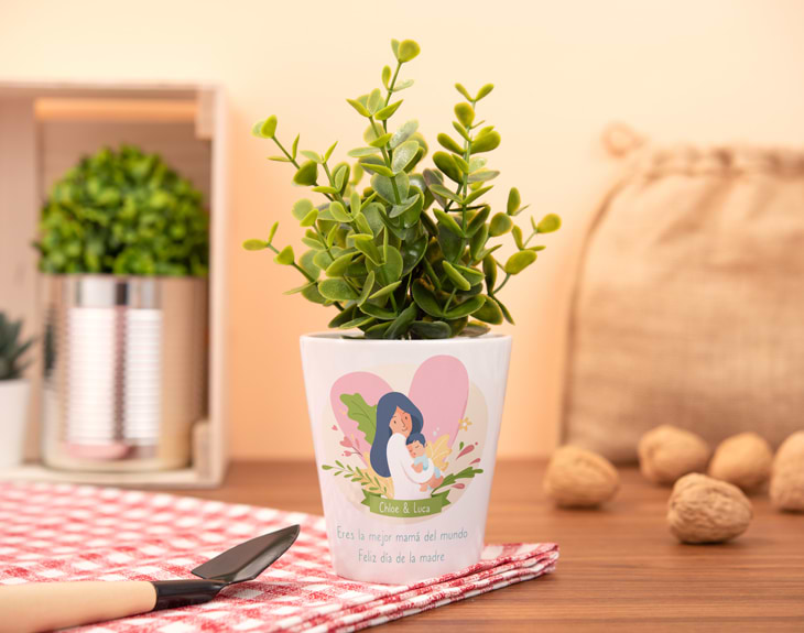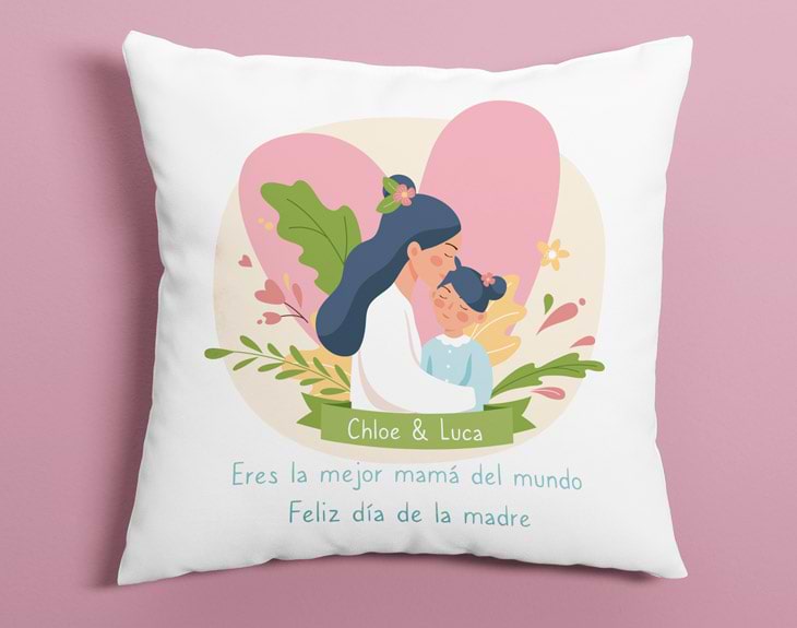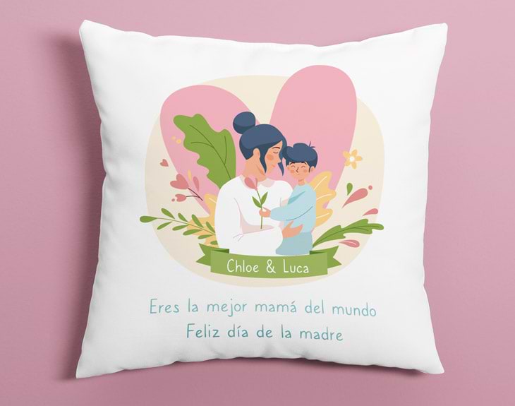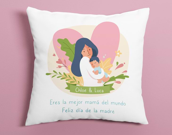 Sabemos que como el amor de una madre no hay ninguno y por eso se merece todo nuestro cariño y respeto. Por estar siempre ahí, apoyándonos y viendo cómo evolucionamos, se merece un detalle de lo más especial como este cojín personalizado. Ser madre no es un trabajo fácil y cualquier madre llega al final del día agotada, y no hay nada como descansar en un cojín hecho especialmente para ella. ¡Le encantará! Su cumpleaños o el Día de la Madre son fechas importantes en las que toca sorprender a mamá y este original cojín es el regalo perfecto. Podrá utilizar para descansar sobre él siempre que lo necesite o como decoración encima de la cama o en el sofá. Este cojín se convertirá en el mejor que ha tenido nunca, porque además es muy suave y súper cómodo. ¡Perfecto para todas las madres! Pero lo mejor de este regalo tan especial es que podrás personalizar este cojín para mamá. Añade el producto al carrito, entra en el área de personalización y comienza a crear tu propio diseño. Elige qué opción te gusta más (bebé, hijo o hija con mamá) y después podrás escribir vuestros nombres y una breve dedicatoria para que nunca se le olvide. ¡El regalo más especial del mundo! Si te ha gustado este diseño y quieres sorprender a mamá por dos, elige el pack que incluye cojín y taza personalizados. Podrás tener este diseño en ambos productos para que mamá tenga el combo completo de taza y cojín para utilizarlos cuando más lo necesite. ¡Es genial!