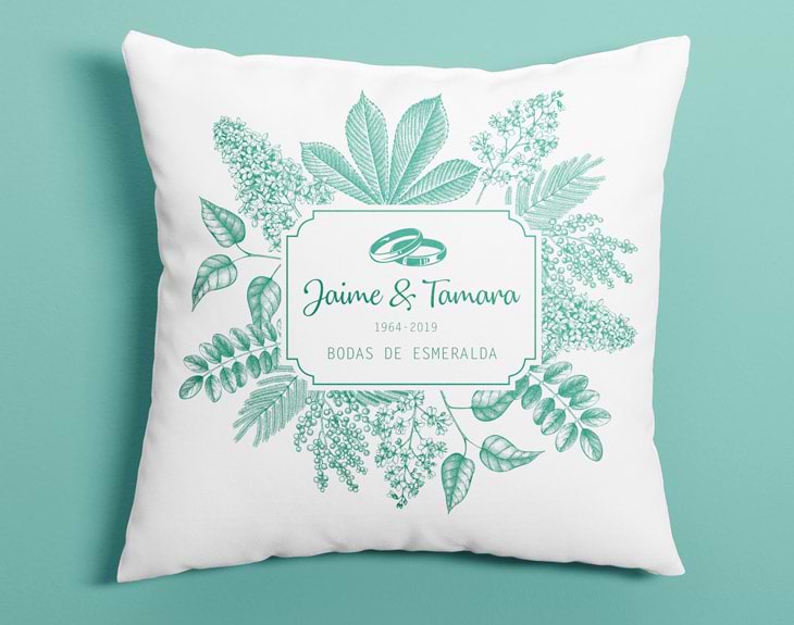 Llegar a los 55 años de casados no es nada fácil, por eso, las parejas que alcanzan esta cifra de récord se merecen un regalo a la altura. Si tus abuelos o padres están a punto de acercarse a esta fecha tan especial, no dudes en sorprenderles con nuestro precioso cojín Bodas de Esmeralda Floral. Un recuerdo que, seguro, les llenará de emoción. Nuestro cojín está fabricado en una suave tela de poliéster blanca y, sobre él, encontraremos un delicado diseño floral que enmarca lo más importante del regalo: los nombres de la feliz pareja y sus años de relación. ¡55 años de casados no se cumplen todos los días! Tanto si preparas una fiesta especial para ellos como si solo quieres tener un detalle que les recuerde sus millones de anécdotas juntos, el cojín Bodas de Esmeralda Floral ¡les dejará sin palabras!