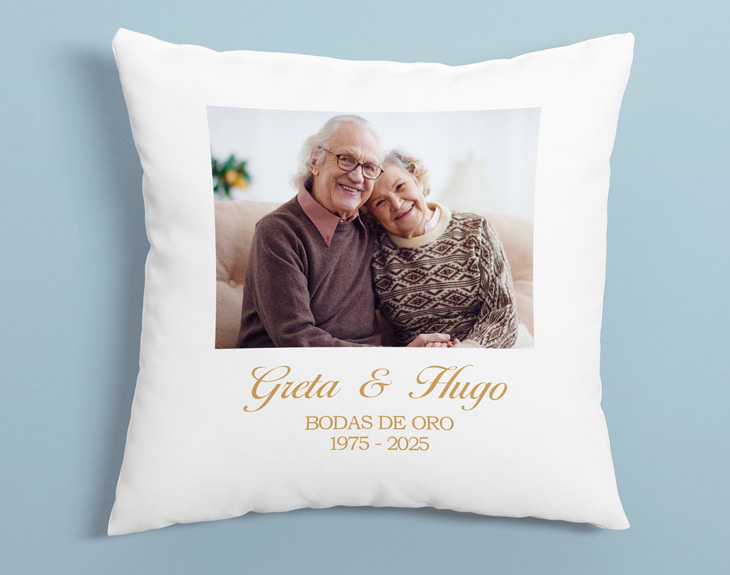 ¿Se acerca el 50º aniversario de tus padres o abuelos y quieres sorprenderles con un detalle único y emotivo? Tenemos el regalo perfecto: nuestro cojín "Bodas de Oro" personalizado con foto. Con un diseño elegante y lleno de cariño, podrás incluir vuestra foto favorita de la pareja y añadir un mensaje especial debajo. ¡Una sorpresa que les emocionará hasta las lágrimas! Lo mejor de todo es que este cojín es personalizado. Bajo la foto que elijas, podrás escribir vuestros nombres, la fecha de su boda y la de su 50º aniversario. Porque un acontecimiento tan importante merece ser celebrado de una manera única, y qué mejor que con un recuerdo que podrán ver todos los días en su hogar. Además, podrás elegir entre varias opciones: cojín mini, cojín de 1 metro x 1 metro, o incluso completar el regalo con una taza personalizada. Así, podrán empezar cada día con un delicioso café o té caliente, recordando su gran celebración y el amor que les rodea. Solo añade la opción que quieras al carrito y entra al área de personalización. Allí podrás personalizar este cojín como tú quieras. ¡Les encantará!