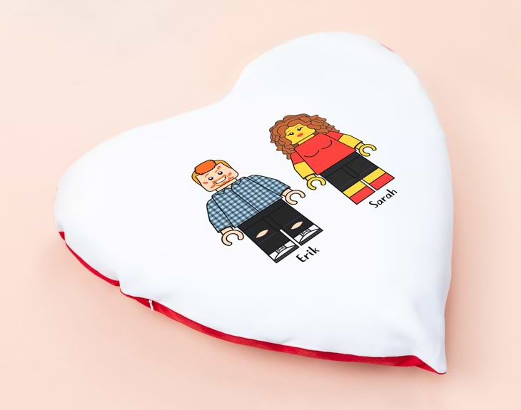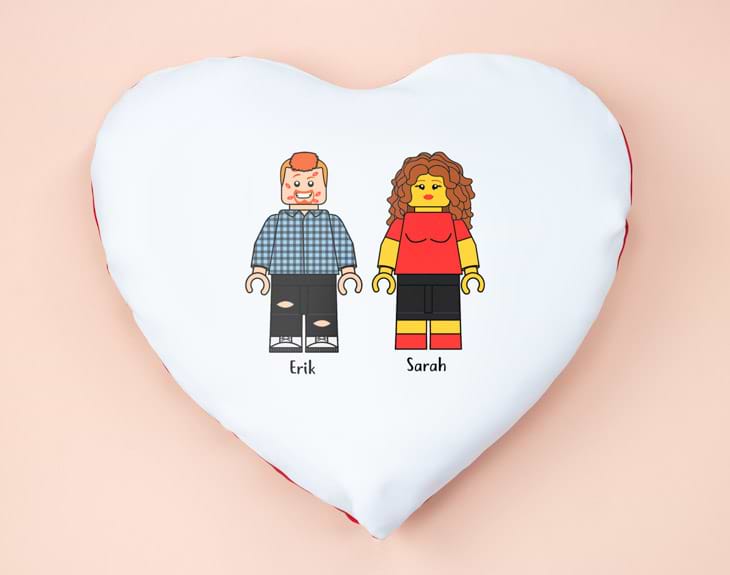 Cuando llega el momento de sorprender a ese alguien especial que tenemos en nuestra vida, todos vamos a pensar en qué clase de productos le pueden hacer ilusión. Volver a la infancia siempre es un detalle que hace que a todos se nos ablande el corazoncito. ¿Por qué no hacerlo de una forma original? Crea vuestros propios personajes Lego y nosotros los plasmaremos en este cojín personalizado. ¿Qué mejor manera de darle todo tu amor a tu pareja que con este cojín en forma de corazón con diseño Lego? ¡Será como regalarle todo tu corazón en un solo producto! Este cojín está formado por dos colores: blanco por delante y rojo por detrás. Cuenta con una altura de 30 centímetros y una longitud de 35 centímetros. ¡Será un detalle de lo más bonito! Además, podrás fusionar su infancia con vuestro amor gracias a este regalo original romántico. ¡Crearéis vuestros propios personajes Lego! Si alguna vez has querido saber cómo serías en versión Lego, esta es vuestra oportunidad. Entra en el portal de personalización y crea desde 0 a estas figuritas. Peinados, ropas diversas, rasgos... ¡Utiliza nuestros elementos para crearos en formato Lego!