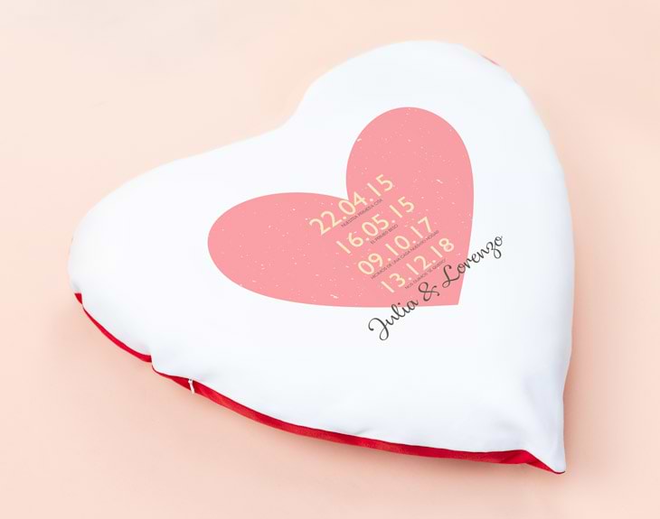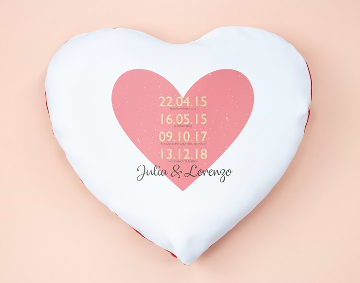 Seguro que has vivido muchísimos momentos inolvidables junto a tu pareja. Desde el primer instante en el que vuestras miradas se cruzaron comenzasteis un camino que os ha llevado a este momento. Viajes, cenas románticas, aniversarios, familiares... ¡Reúne todos esos instantes mágicos en este cojín personalizado! No habrá mejor forma de mantener la llama del amor que con una sorpresa como este cojín en forma de corazón con diseño romántico. ¡Reviviréis los mejores momentos de vuestra relación en un producto de lo más cómodo! Este cojín cuenta con dos colores: blanco por delante y rojo por detrás. Cuenta con una altura de 30 centímetros y una longitud de 35 centímetros. ¿Qué mejor manera de sorprender al amor de tu vida que con un regalo original romántico como este? Podrás personalizar este comodísimo cojín con las fechas inolvidables de vuestra relación, lo momentos que fueron un punto de inflexión. ¡Añade el producto al carrito y entra en el área de personalización! Podrás escribir las fechas que quieras en los cuadros de texto que encontrarás en la plantilla.