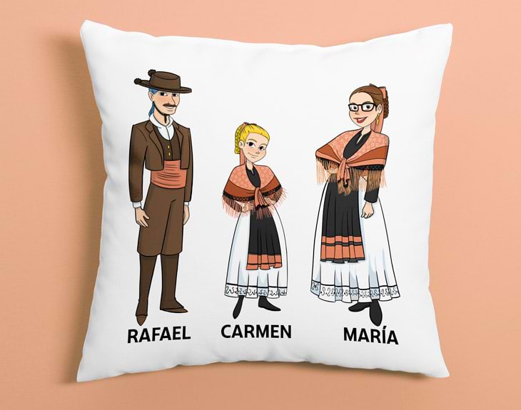 Las tierras de Castilla son muy extensas. Esta comunidad autónoma está llena de una historia increíblemente interesante y de unos paisajes campestres que no se pueden comparar con otros de nuestro país. ¿Quién no ha viajado alguna vez por Castilla-La Mancha, confundiendo molinos con gigantes como el Quijote de Cervantes? Esta tierra tiene un valor cultural incuestionable. Da igual si procedes de Guadalajara, Toledo, Cuenca, Ciudad Real o Albacete. Cada una de estas provincias es mágica a su manera, con elementos culturales inconcebibles en otros lugares de España. ¿Quién no ha degustado alguna vez un riquísimo queso manchego, o visitado algunos de los pueblos más característicos de la comunidad? ¡Es el momento de estar muy orgulloso de tu tierra! Por eso, queremos que tengas un recuerdo de ella, y este cojín personalizado es el producto idóneo para cumplir este cometido. ¿Tienes a un manchego como amigo? ¿vas a visitar a tu familia en Ciudad Real y quieres tener un detalle con ellos? Con este cojín, todos os vestiréis con los típicos trajes manchegos, que se utilizaban durante los siglos XVIII y XIX en la región. Podrás crear tu propia familia manchega... ¡Contamos con más de 100 personajes diferentes! De esta manera, todos estaréis representados en este regalo original. ¡Un detalle para los más manchegos! Importante: nuestro equipo de personalización se encargará de ajustar la distribución de los personajes en el producto en función de su tamaño para que se vean lo mejor posible.