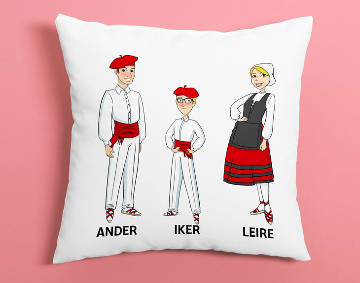 ¡Cuantísimas zonas bellas tiene España! No nos podemos quejar del país que tenemos, al menos en cuanto a lo que a belleza se refiere. Podríamos nombras muchísimas regiones cuya hermosura es tremendamente notable, pero no podríamos dejar de nombrar al País Vasco. No solo cuenta con unos paisajes increíbles, llenos de mar, bosque y naturaleza. Además, cuenta con una grandísima cultura, que va desde el arte o la pintura hasta la gastronomía. A todos nos gusta un buen Pintxo o un riquísimo bacalao al pil pil, de eso no hay duda. La cultura vasca es abundante, y cuenta con muchísimos acontecimientos, lugares y actividades con las que se celebra y homenajea al País Vasco. ¿Quién no ha querido visitar ciudades tan bonitas como San Sebastián o Vitoria? Si tienes una amigo vasco que no deja de hablar de lo estupenda que es su tierra, este cojín personalizado le encantará. ¡Le recordará a sus orígenes! Y es que este cojín no es como otro cualquiera. Podrás crear tu propia familia vasca, vistiendo los clásicos trajes regionales de la comunidad. ¿Siempre has querido ver a tu familia con estos míticos trajes? ¡Contamos con más de 100 personajes diferentes! Escoge hasta 8 personajes en este regalo original que dejará sin palabras a cualquier vasco que se precie de serlo. Importante: nuestro equipo de personalización se encargará de ajustar la distribución de los personajes en el producto en función de su tamaño para que se vean lo mejor posible.