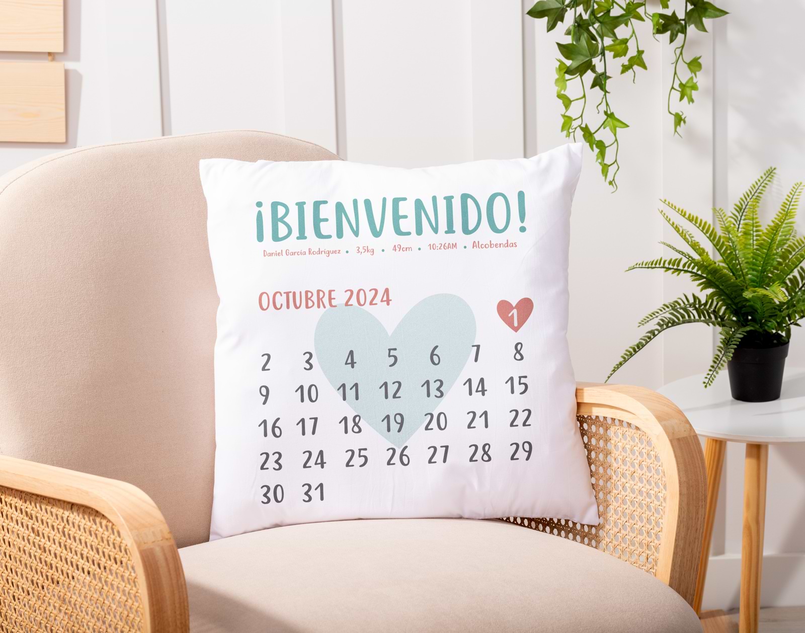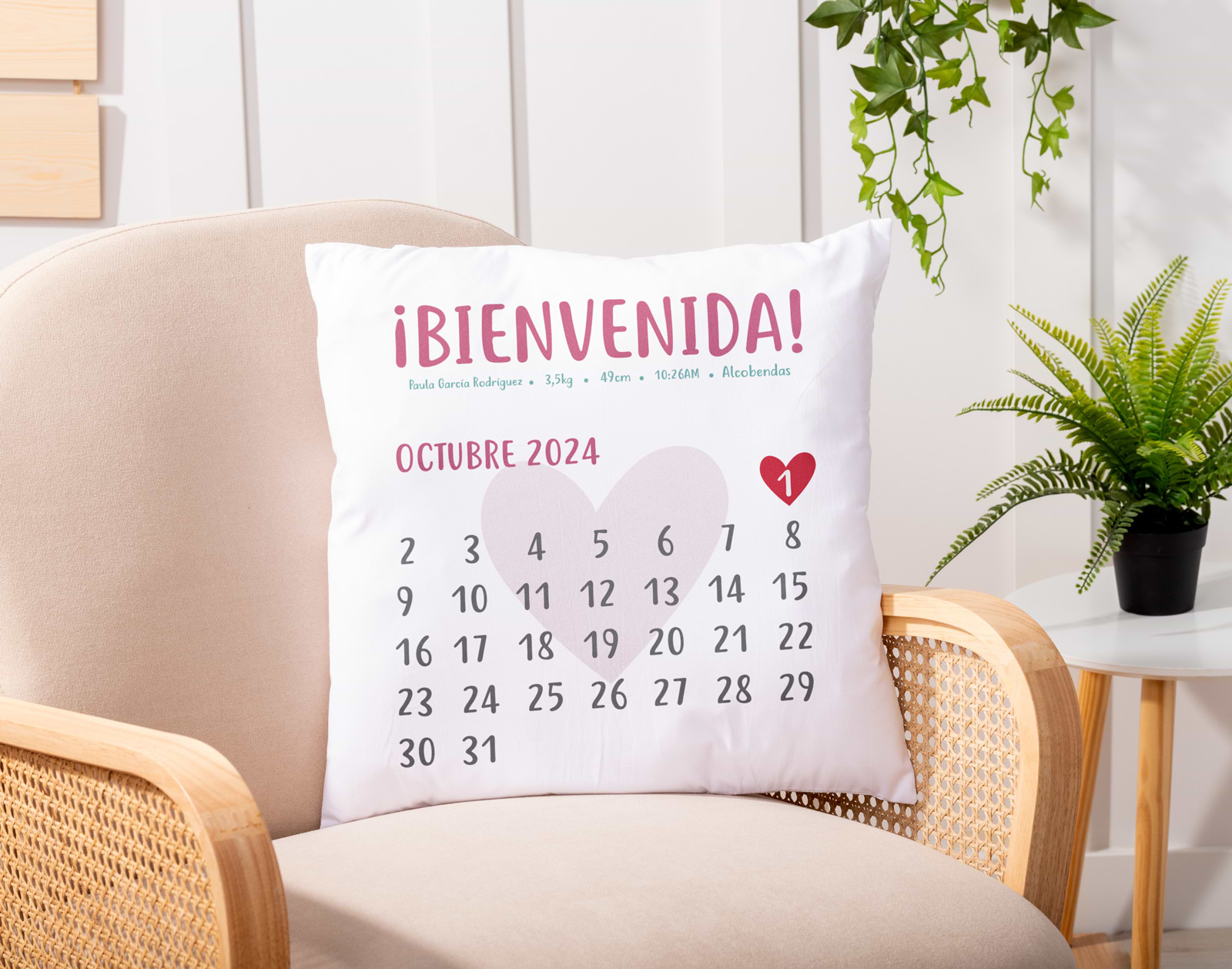 El calendario de nacimiento más original que hayas podido encontrar. Si recientemente ha nacido tu prima, sobrina o hija, y se suma una nueva personita a la familia, este regalo original es estupendo para el bebé. Personalízalo con el nombre del recién nacido, su fecha de nacimiento, el lugar, la estatura y el peso, y recibirás en casa este precioso cojín personalizado de una manera muy molona y original. Colocaremos un corazón en el día del nacimiento y se quedará para siempre marcado y lleno de amor y ternura.