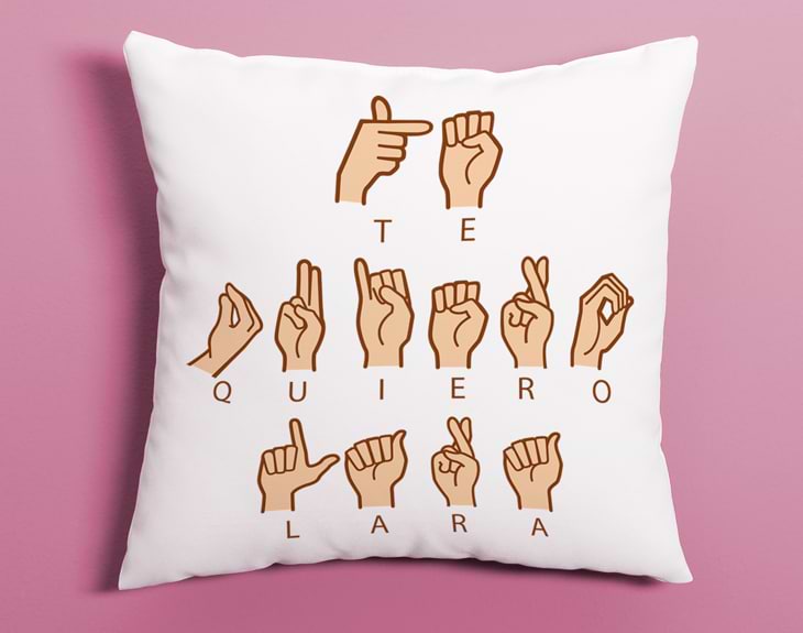 Si quieres sorprender a esa persona especial en tu vida de una forma muy original, este cojín personalizado es ideal para ti. Con este cojín personalizado podrás escribir tu nombre y el de tu pareja en el lenguaje de signos, porque el amor no tiene límites. Seguro que a tu pareja le va a encantar y lo utilizará para echarse la siesta. El lenguaje de signos que se muestra se corresponde con el sistema internacional. Antes de pagar te preguntaremos por el nombre que quieres poner en el cojín y nosotros nos encargaremos de que el diseño quede súper chulo. ¿No te parece un regalo de lo más original?
