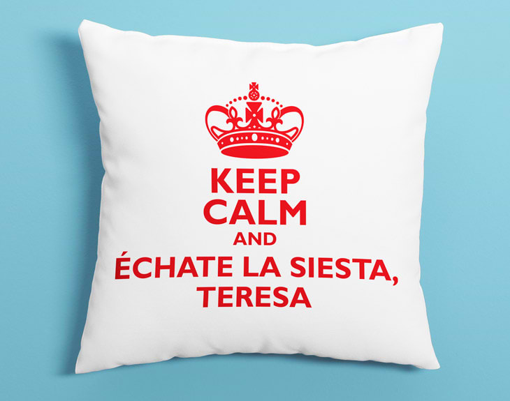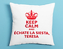Es hora de relajarse después del trabajo o del estudio. Te tumbas en el sofá o en la cama y necesitas algo cómodo donde apoyarte. La mejor opción es este cojín personalizado para que mantengas la calma con el mensaje que quieras dejarte. ¿Un poco de relax? ¿Un recordatorio de echarte la siesta? ¿Un chiste? ¡Tú eliges el mensaje! Completa el famoso eslogan y nosotros lo inscribimos en el cojín con la misma tipografía. Reposa la cabeza sobre este cómodo cojín de 40cm x 40cm que viene además con relleno incluido. A partir de ahora, todo el mundo en la casa querrá dormir con el cojín más original bajo vuestro techo. Para evitar esas peleas, puedes acompañar este cojín con una taza a juego. Aunque tengan el mismo diseño, puedes personalizar ambas con mensajes distintos. ¿Uno para echarse la siesta y otro para despertarse? ¿Dos juegos de palabras diferentes? Añade el producto al carrito, dale a "personalizar", ¡y deja volar tu imaginación! Importante: si eliges la opción que incluye taza, esta será de cerámica.