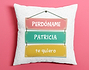En muy poco espacio se pueden decir muchas cosas. Si solo tuvieras dos o tres renglones para expresar lo que sientes, ¿que palabras escogerías? Ve pensando en ellas y en el color de fondo que más le gusta a la persona destinataria. Tu método de mensaje no será una carta, sino este cojín en color personalizado. Además de ser una dedicatoria personal y original, ¡no se esperará que lo hagas así! Gracias a esta funda de cojín personalizada con relleno extraíble incluido, tu pareja podrá recordar esta declaración de amor todos los días. También puede ser un regalo original para pedir perdón o escribir un mensaje sincero que le acompañe cada vez que se vaya a dormir. A todo color y con sus 40 centímetros de ancho y alto para ser tan bonito como cómodo. Añade este cojín con funda personalizada al carrito y añade tus textos o fotos sobre los varios diseños disponibles. ¡En rojo, verde y amarillo, o todos juntos! Importante: Este modelo está disponible en diferentes colores, únicamente tendrás que seleccionar "Ver más diseños" en nuestro diseñador para poder descubrir todas las opciones y escoger tu favorita.
