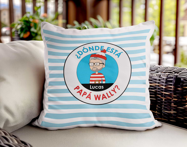Si tu padre es todo un experto en encontrar a Wally y siempre está proponiendo juegos, ¡tenemos el regalo más divertido y original para él! Sorpréndele con un cojín personalizado con diseño “¿Dónde está papá Wally?”, un detalle que no se esperará y que le encantará. Lo mejor de este cojín original es que puedes crear un personaje al más puro estilo Wally… ¡pero con la cara de tu padre! Elige entre diferentes rasgos para personalizarlo: gafas, peinados, barba, y por supuesto, su característico jersey y gorro de rayas. ¡Será como buscar a papá entre una multitud! Personalizar este cojín es muy fácil: solo tienes que añadir el producto al carrito y acceder a nuestro diseñador online. Allí podrás elegir el color del fondo (rojo o azul) y crear el personaje a tu gusto. Nosotros nos encargamos del resto para que recibas un regalo divertido y muy especial. Ideal para el Día del Padre, su cumpleaños o simplemente para sacarle una gran sonrisa.