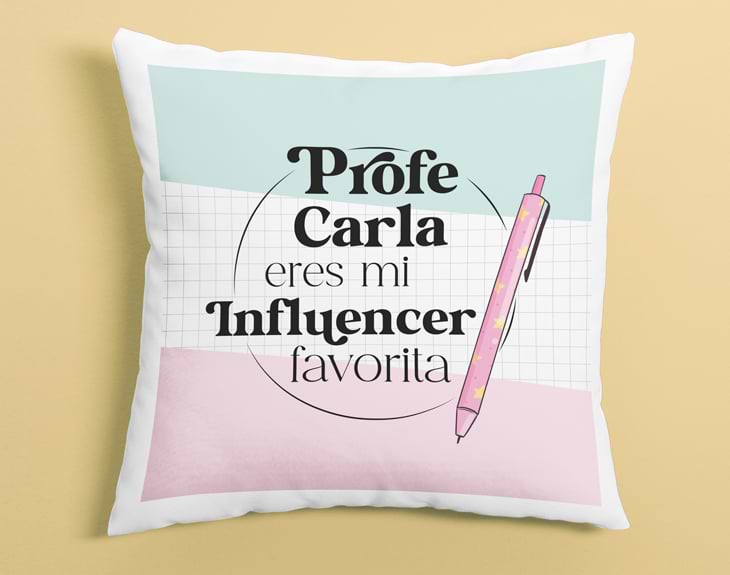 Los profesores tienen un gran impacto en el aprendizaje de sus alumnos. Y es que, casi casi tiene la misma influencia que los mismísimos influencers pero a su estilo propio. Ya que un profe puede hacer que sus alumnos adoren su asignatura, que resulte interesante o divertida, y que de verdad aprendan en sus clases. Si el curso ha llegado a su fin y ahora os toca despediros de vuestro profe favorito. Ese profe que os ha hecho disfrutar realmente de su asignatura. Está claro que tenéis que hacerle un regalo para agradecerle todo su esfuerzo y para demostrarle que de verdad os han gustado mucho sus clases. Este cojín personalizado “Profe influencer” es ideal para demostrarle que se ha convertido en vuestro influencer favorito. ¡Nunca se olvidará de vosotros! Personalizar este cojín “Profe influencer” es súper sencillo. El primer paso a seguir es añadir el producto al carrito y entrar al área de personalización. Una vez ahí, nos decís el nombre del profesor/a y nosotros nos encargamos de que quede perfecto y listo para regalar. ¡El mejor regalo para profes!