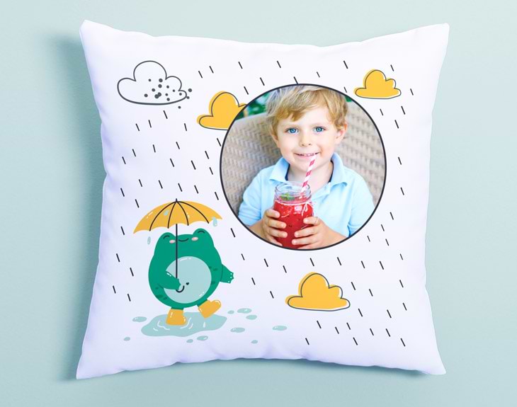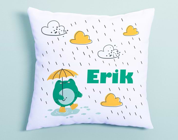 Los cojines son perfectos para descansar cuando más lo necesitamos. Nos ayudan para que podamos reposar nuestra cabeza y nuestro cuello y estar tranquilos durante un ratito. Pero no solo son un elemento para poder descansar si no que también son un elemento decorativo. Quedan perfecto encima del sofá o de la cama y están ahí para que podamos utilizarlos siempre que queramos. Este cojín personalizado está hecho especialmente para los más pequeños de la casa, con un divertido diseño pensado para ellos. Podrán decorar su cuarto con este súper cojín y tenerlo siempre a mano para descansar cuando quieran. Este original cojín puede ser el regalo perfecto para sorprender a los más peques en su cumpleaños o en alguna fecha especial para ellos. Estamos seguros de que les hará muchísima ilusión recibir un cojín en el que pueden ver su nombre o una foto suya junto a esta divertida ranita con su paraguas que intenta no mojarse por la lluvia. Este diseño quedará perfecto sobre su cama y combinará sin problema con la decoración de cualquier habitación. ¡Es el mejor regalo del mundo! Pero antes de finalizar la compra, no te olvides que tienes que personalizar tu propio cojín. Añade el producto al carrito y elige cómo quieres personalizarlo: solo con texto o solo con foto. ¿Qué opción te gusta más? Ambas quedarán genial en este súper cojín porque podrás poner el nombre que quieras o tu foto favorita. Este detalle conseguirá conquistar el corazoncito de los más peques y podrán utilizarlo siempre que quieran. Pero si quieres, puedes elegir el pack que incluye cojín y taza personalizados. Podrás llevarte ambos productos y personalizarlos como tú quieras, con el mismo nombre y que sea un regalo para el mismo niño o niña o con nombres diferentes y así poder hacer dos regalos. ¡Tú decides! Medidas: 40 x 40 cm.