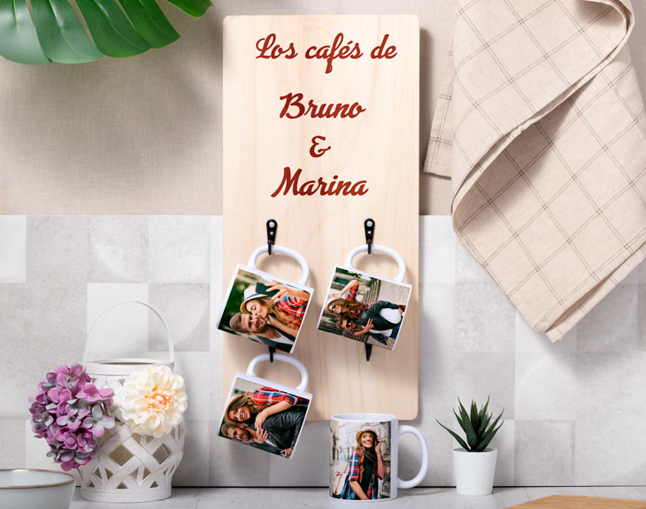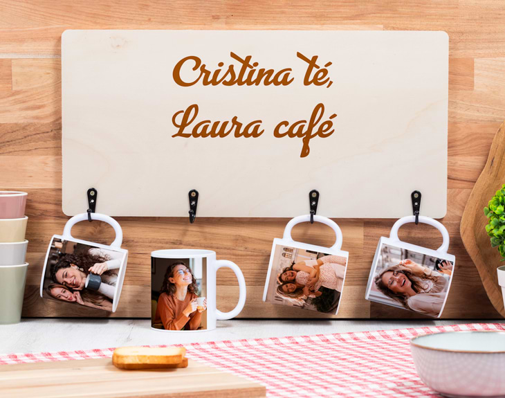 Pocos placeres hay mejores que despertarse y prepararse un café bien calentito para empezar el día con toda la energía del mundo. Pero para hacer de este momento algo único, necesitas tener tu propio colgador para tazas de madera personalizado. Ese rinconcito que tienes para el café está pidiendo a gritos que coloques este adorno hecho de madera natural en el que podrás colgar tus tazas favoritas para tenerlas siempre a mano y servirte un buen café. En la cocina, al lado de la cafetera... ¡Quedará genial donde tú quieras! Este original adorno de madera es ideal porque además de ser bonito es muy práctico. Cuenta con cuatro colgadores de color negro en los que podrás poner esas tazas que tanto te gustan y tenerlas siempre a mano. Pero espera porque podrás elegir la opción que más te guste: solo el colgador en horizontal o en vertical o la opción del colgador más cuatro tazas personalizadas. ¡Triunfarás con este regalazo! Si quieres sorprender a esa persona que no puede vivir sin café, hazlo personalizando este colgador a tu gusto. Elige la opción que más te guste y añade el producto al carrito. En nuestro diseñador podrás personalizar el colgador con el texto o imagen que quieras. Si has elegido la opción que incluye las cuatro tazas, también podrás personalizarlas con la foto o diseño que más te guste. Crea este colgador a medida y colócalo en tu sitio favorito. ¡El café sabrá mucho mejor! Medidas: 49,5 x 24 centímetros. Material: madera.