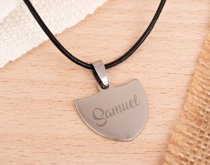 • Colgante escudo de acero. • Cadena de metal o cordón de cuero negro. • Tarjeta Recordatoria.