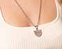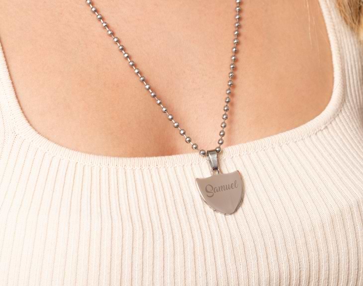 Colgante personalizado con forma de escudo. Grabamos en él el texto que desees, convirtiéndolo en un artículo único e irrepetible. Está hecho en acero. Vale, no es tan fuerte como el vibranium o el adamantium, pero este pequeño escudo colgante será un regalo perfecto.