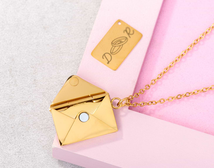 Algunas fechas merecen ser recordadas para siempre. Este colgante con forma de sobre es un detalle íntimo y elegante, pensado para celebrar el amor verdadero. Ya sea como regalo de boda, aniversario o para un momento especial compartido solo por dos. El colgante se abre como una pequeña carta guardada cerca del corazón. Dentro, encontrarás una placa grabada con el mensaje que tú elijas: vuestras iniciales o una fecha especial . Un detalle especial con un gran significado. El diseño incluye unas delicadas alianzas entrelazadas, símbolo eterno de compromiso y unión. Un detalle que emociona y que habla por sí solo, perfecto para sorprender a tu pareja o regalar a una pareja de recién casados. Personalizar este colgante es muy sencillo: solo tienes que añadir el producto al carrito y escribir el texto que deseas grabar. Nosotros lo convertimos en un regalo original y para toda la vida. Medidas aproximadas: 2 cm (ancho) x 1,5 cm (alto). Material: acero inoxidable.