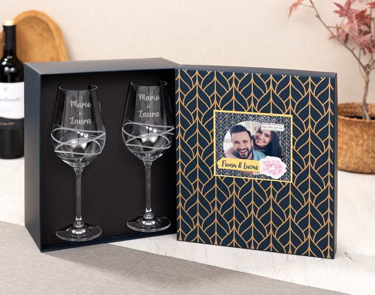 Si quieres sorprender a tu pareja, no dudes más y hazte con este estuche con copas de vino con Swarovski®. Se convertirá en un regalo único. Imagina estar tranquilamente con esa persona tan especial bebiendo vino en estas copas y disfrutando de vuestra compañía, sin duda, será una cita inolvidable que se quedará grabada en vuestra memoria. Piensa en la cara que pondrá al recibir este pack de copas con el estuche personalizado tan bonito, seguro que le hace muchísima ilusión este regalo tan original. ¡Acertarás seguro! Además, tienes la opción de elegir personalizar solo el estuche o además, también personalizar las copas, podemos grabar vuestros nombres en el cristal. Es ideal para regalar en vuestro aniversario, en alguna fecha especial para ambos, o simplemente por tener un detalle con tu pareja para demostrarle todo tu amor. Y te preguntarás… ¿Cómo se personaliza este producto? Lo primero es añadirlo al carrito y entrar al área de personalización. Después, lo único que tendrás que hacer es elegir una foto de entre toda tu galería y escribir vuestros nombres. Nosotros nos encargamos de que quede perfecto y ¡Pronto podrás disfrutar de estas copas tan maravillosas! Cómo cuidar tus copas: para mantener la belleza de tus copas por favor sigue las instrucciones con cuidado. Es importante evitar que sean expuestas a altas temperaturas. Lávalas siempre a mano, con mucho cuidado de no dañar los cristales. Seca con un trapo suave, sujetando la pieza por la parte superior. No aptas para lavavajillas. Capacidad de las copas: 240 ml. Dimensiones del estuche: 29 × 25 × 12.5 cm