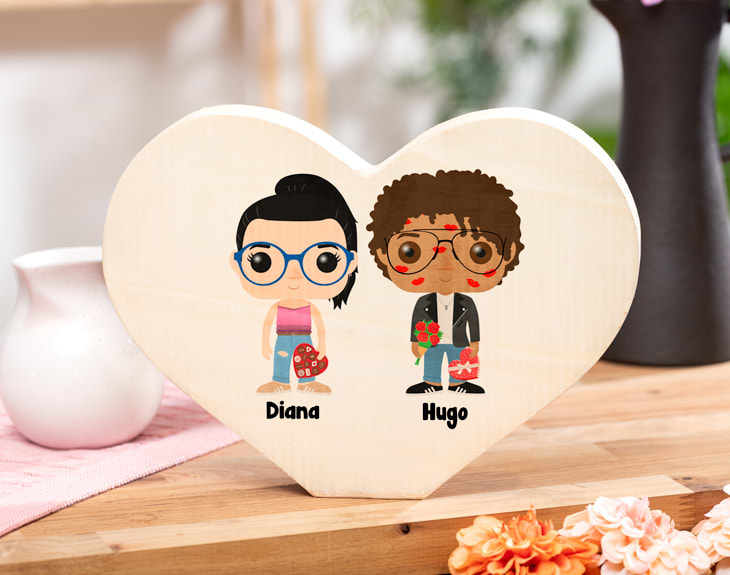 Un corazón de madera con esa persona especial, vosotros dos o toda la familia... ¡convertidos en Tinoks! Un regalo romántico y que servirá para sorprender en infinidad de ocasiones. Medidas: 30 x 22 x 3 cm. Importante: Las maderas tienen vetas y estas quedan reflejadas en la imagen. Importante: a partir de 6 personajes, se distribuirán en dos filas en los productos. Es decir: - Familia de 6 personajes: 3 en la fila superior, y 3 en la inferior. - Familia de 7 personajes: 4 en la fila superior, y 3 en la inferior. - Familia de 8 personajes: 4 en la fila superior, y 4 en la inferior.