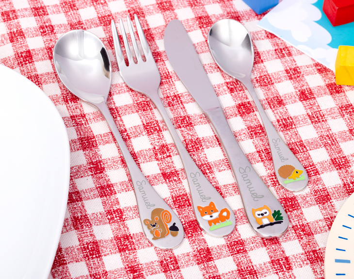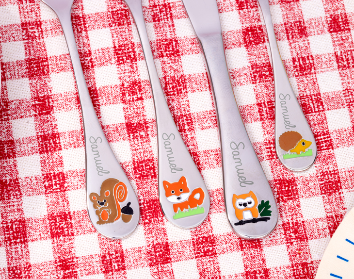 Una cubertería sin níquel para los niños más divertidos. Los cubiertos tiene el tamaño ideal para ser utilizados por los más pequeños: el cuchillo viene ligeramente afilado para no causar ningún accidente. Se trata de un regalo original fabricado con con acero inoxidable 18/10 sin níquel pulido y decorado con relieves de animales del bosque. El niño podrá encontrarse con una ardilla, un zorro, un búho y un erizo, mientras come su plato favorito. ¡Es ideal para los más pequeños! Personalízalo con su nombre y ya lo tienes hecho.