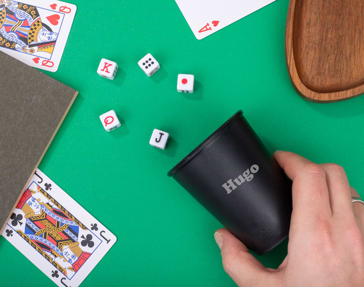 Un juego de dados en el que se gana si obtienes el mayor puntuaje. Este cubilete grabado contiene cinco dados para jugar a la Generala, un juego de mesa muy divertido en el que se escuchan muchas risas, y por supuesto, piques también. Si eres de los que se reúne con su familia o amigos para disfrutar de unas divertidas tardes de lluvia jugando a juegos de mesa, este cubilete es perfecto para el más fanático. Es similiar al Póker pero con otros dados y otras reglas. Personaliza el cubilete con el nombre o texto que quieras, y disfruta jugando con tus seres queridos.
