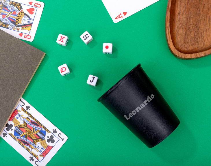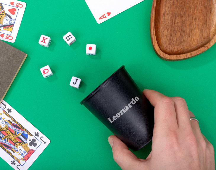 Nuestro cubilete grabado es perfecto para los amantes del Póker. Este juego tiene muchísimas modalidades, y una de ellas es jugar con dados. Este cubilete guarda cinco dados de póker para jugar con todos los amigos al Póker mentiroso. Se trata un juego en el que en cada mano no resulta un ganador, sino un perdedor, quien sumará puntos durante la partida. Es un juego muy divertido para las reuniones con amigos o familiares. Si conoces a alguien apasionado al Póker o a los juegos de mesa, personaliza el cubilete con su nombre y sorpréndele cuando le veas
