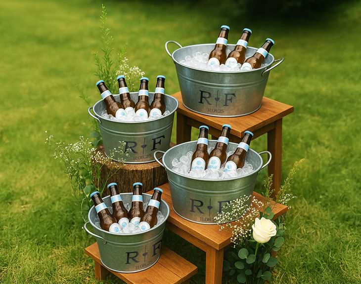 El día de tu boda es para vivirlo con amigos y familia, y si sois de los que no paráis de bailar, necesitaréis estar bien hidratados. Aquí es donde sorprenderás a todos tus invitados: imagina lo original y elegante que será que cada uno coja una cerveza de un cubo personalizado con vuestras iniciales y la fecha del gran día.