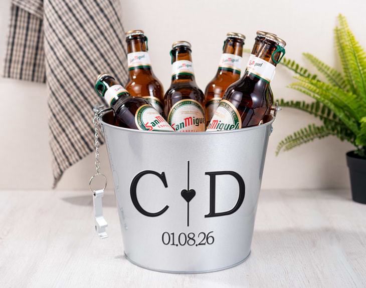 Si hay algo que no puede faltar en cualquier celebración, es una bebida bien fría. Por eso, este cubo de cerveza personalizado es justo lo que necesitas. Con un diseño de "Iniciales de amor", reflejará a la perfección el amor de vuestra pareja. Un detalle único que todos adorarán.
