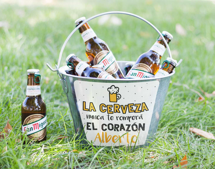 Te pueden romper el corazón de miles de maneras distintas, pero lo que nunca te fallará es la cerveza. ¡Jamás te romperá el corazón, al revés, estará contigo siempre!. Por eso, este cubo de cerveza personalizado es perfecto para dar una sorpresa a ese amigo o amiga que está pasando por un momento complicado. No hay mejor terapia que una buena cerveza y una charla con amigos, es capaz de curar cualquier mal de amor, por duro que sea. Así que no pienses más, saca una gran sonrisa a esa persona con este divertido cubo. Solo necesitamos que nos digas su nombre para insertarlo en el diseño y conseguirás que por un segundo se olvide de todo y se centre en disfrutar. ¡Seguro que lo valora muchísimo! Importante: Las cervezas no están incluidas en las opciones de cubo solo. En el caso de escoger la opción con las 6 cervezas y que además estén personalizadas, todas ellas irán personalizadas con la misma imagen en la etiqueta grande y el mismo texto en la etiqueta del cuello. En las opciones de 2 cubos, puedes personalizar cada cubo con un diseño distinto. Medidas: - Cubo 6 litros: 24 x 22 x 19 cm. - Cubo 9 litros: 35 x 26 x 20 cm.