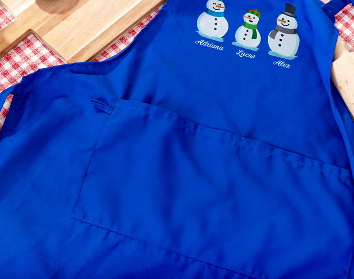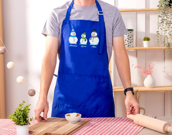Navidad es el mejor momento para sacar tus habilidades secretas en cuanto a la cocina se refiere. Por eso, este delantal personalizado es perfecto para darte el empujon que necesitas en esta época tan mágica del año. Porque cocinar con tu propio delantal de muñecos de nieve es mucho más guay, ¿no? Sorprende a esa persona que está hecho todo un chef con el mejor regalo de Navidad del mundo: ¡este original delantal! Sin duda, nuestro delantal azul oscuro con hebilla ajustable será el detalle perfecto para esta época del año. ¡Triunfarás seguro! Pero antes de colocarlo bajo el árbol de Navidad, tienes que personalizarlo. Una vez entres en el diseñador, podrás elegir los muñecos de nieve que más te gusten y añadirle a cada uno el nombre que quieras y que aparecerá debajo. ¡La Navidad así mola mucho más! Medidas del delantal: 94 x 70 cm. Medidas de cada tira: 97,5 cm.