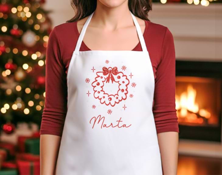 Invade tu cocina con el espíritu navideño gracias a este delantal blanco personalizado, perfecto para preparar tus recetas favoritas con más pasión y toda la alegría que nos inspiran estas fiestas. Es un regalo de Navidad ideal para mamá, esa chef de casa que siempre nos consiente con nuestros platos preferidos, especialmente cuando se reúne toda la familia, se cocina rico, se ríe a carcajadas y se disfruta a lo grande. Este accesorio de cocina no falla cuando se trata de sacar a relucir tus dotes culinarias. Elige entre sus diseños navideños de guirnalda, flores de pascua o cajitas de regalo, y personalízalo con el nombre que tú quieras para hacerlo totalmente único. Su color blanco aporta ese toque elegante que combina a la perfección con la decoración navideña de tu hogar. Sorprende a todos en la cena con este delantal de cocina navideño y déjales con la boca abierta, incluso antes de probar la comida. Personalizarlo es facilísimo: añade al carrito, elige el diseño que más te guste y listo. Tendrás un regalo original de Navidad que te acompañará en cada comida hecha con amor y mucha ilusión. Medidas aproximadas: Delantal blanco: 84 x 57 cm Cintas del delantal blanco: 60 cm cada una Material: 100 % poliéster