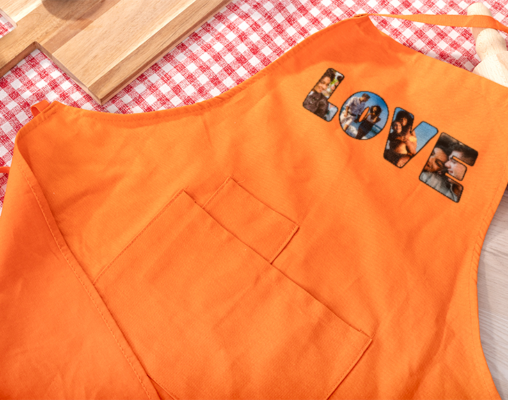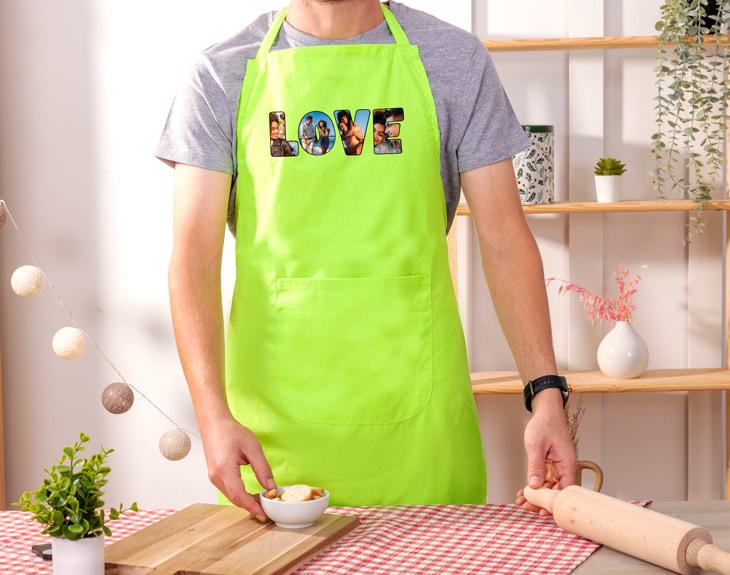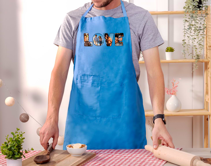 Si ya tienes todo preparado para sorprender a tu pareja el día de San Valentín, este delantal de cocina personalizado será el complemento perfecto. Véndale los ojos, y sorpréndele con unos buenos platos este delantal con hasta cuatro fotos vuestras. Personaliza la palabra LOVE con cuatro imágenes de vuestro amor y disfruta de su cara cuando te vea. Tenemos disponibles hasta 5 colores para que elijas el que más pegue con el momento romántico. -Medidas aproximadas Delantal de colores: 89x65 cm Delantal blanco: 84x57 cm Material del delantal blanco: 100% poliéster. Material del delantal de color: 65% poliéster, 35% algodón.