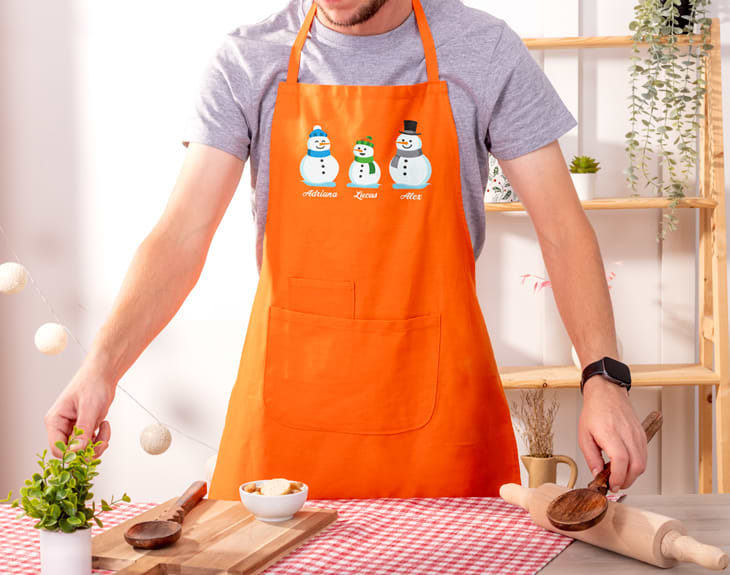 Si la gastronomía es lo tuyo y siempre sacas tus habilidades en Navidad, este es tu regalo perfecto: un delantal personalizado en el que puedes incluir diferentes muñecos de nieve y crear tu propia familia, ¡con los nombres de tus padres y hermanos incluidos! Elige diferentes muñecos, ponle los nombres de los miembros de la familia y disfruta de la época más adorable del año. Importante: a partir de 6 personajes irán distribuidos en dos filas. Es decir: - Familia de 6 personajes: 3 en la fila superior, y 3 en la inferior. - Familia de 7 personajes: 4 en la fila superior, y 3 en la inferior. - Familia de 8 personajes: 4 en la fila superior, y 4 en la inferior. -Medidas aproximadas Delantal de colores: 89x65 cm Delantal blanco: 84x57 cm Material del delantal blanco: 100% poliéster. Material del delantal de colores: 65% poliéster, 35% algodón.