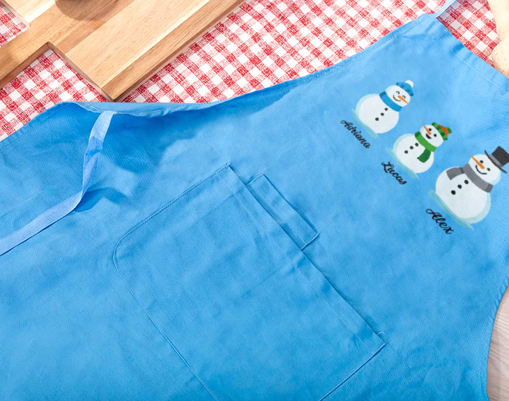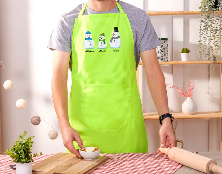 Con nuestro delantal personalizado podrás darle un toque navideño a tu cocina. Si las reuniones familiares en Navidad se basan en comidas hechas en casa con todo el amor y el cariño, este delantal es el regalo perfecto. Elige diferentes muñecos, ponle los nombres de los miembros de la familia y disfruta de la época más adorable del año. Importante: a partir de 6 personajes irán distribuidos en dos filas. Es decir: - Familia de 6 personajes: 3 en la fila superior, y 3 en la inferior. - Familia de 7 personajes: 4 en la fila superior, y 3 en la inferior. - Familia de 8 personajes: 4 en la fila superior, y 4 en la inferior. -Medidas aproximadas Delantal de colores: 89x65 cm Delantal blanco: 84x57 cm Material del delantal blanco: 100% poliéster. Material del delantal de color: 65% poliéster, 35% algodón.