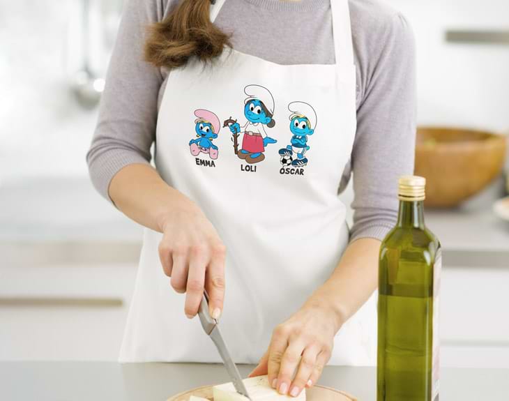 ¿Quién es el que siempre cocina en la familia? Este delantal personalizado es perfecto para darle una alegría. Si no está pasando por el mejor momento de su vida, si va a ser su cumpleaños o si, simplemente, te apetece darle una sorpresa original, empieza a personalizar el delantal de cocina. ¿Cómo puedes hacerlo? Tendrás que elegir máximo 8 personajes pitufos y ponerles nombre a cada uno. ¿Siempre habéis querido en casa ser como esos pequeños seres azules? ¡Este es el momento de darle una sorpresa enorme a toda la casa! -Medidas aproximadas Delantal de colores: 89x65cm. Delantal blanco: 84x57cm. Importante: a partir de 6 personajes irán distribuidos en dos filas. Es decir: - Familia de 6 personajes: 3 en la fila superior, y 3 en la inferior. - Familia de 7 personajes: 4 en la fila superior, y 3 en la inferior. - Familia de 8 personajes: 4 en la fila superior, y 4 en la inferior. -Medidas aproximadas de la cinta del delantal con foto blanco: 60 cm cada tira. Material del delantal blanco: 100% poliéster.