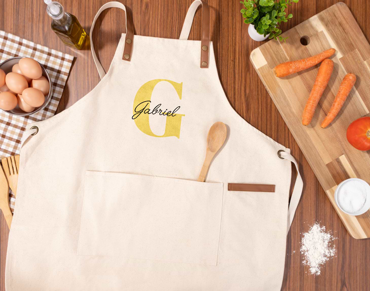 Sabemos que no a todo el mundo le gusta cocinar... Pero seguro que conoces a alguien que sea todo un experto haciendo las mejores recetas del mundo para cualquier ocasión. Y si no conoces a nadie, significa que esa persona eres tú. Por eso, para cocinar de la mejor manera posible, necesitas este delantal vintage personalizado. Es el accesorio perfecto para los más cocinitas del grupo de amigos o de la familia. Le encantará poder llevar en cada cocinado un delantal tan guay como este. ¡Es ideal! Si vas a pasar horas y horas entre los fogones de tu casa, requiere que tengas muchas ganas y amor por la cocina. Por eso, para recompensar a esa persona que da de comer a todo el mundo y te hace tus platos favoritos, hazle el mejor regalo del mundo: ¡nuestro original delantal! Pero no es uno cualquiera porque incluye pequeños detalles que lo hacen único. Es de color beige y parte de sus tirantes están recubiertos de polipiel marrón, que aporta una combinación perfecta. También podrás atarlo de manera muy original, como ves en la imagen, por la parte de atrás para que quede perfecto y se adapte a cualquier persona. Pero es que además, en la parte delantera cuenta con un amplio bolsillo para guardar lo que quieras. ¡Lo tiene todo! Para personalizar este delantal vintage sigue nuestros pasos porque es súper fácil. Añade el producto al carrito y entra en el área de personalización. Ahí puedes completar este precioso diseño que te dejamos, en el que podrás poner la inicial y nombre que quieras, además de elegir el color que más te guste. Será el mejor compañero del mundo para pasar los días en la cocina. ¡Es genial! Dimensiones: 75 x 65 cm (aprox). Material: 100% algodón. Cintas de cuello y cintura de algodón decoradas (en algunas zonas) con polipiel marrón y remaches metálicos.