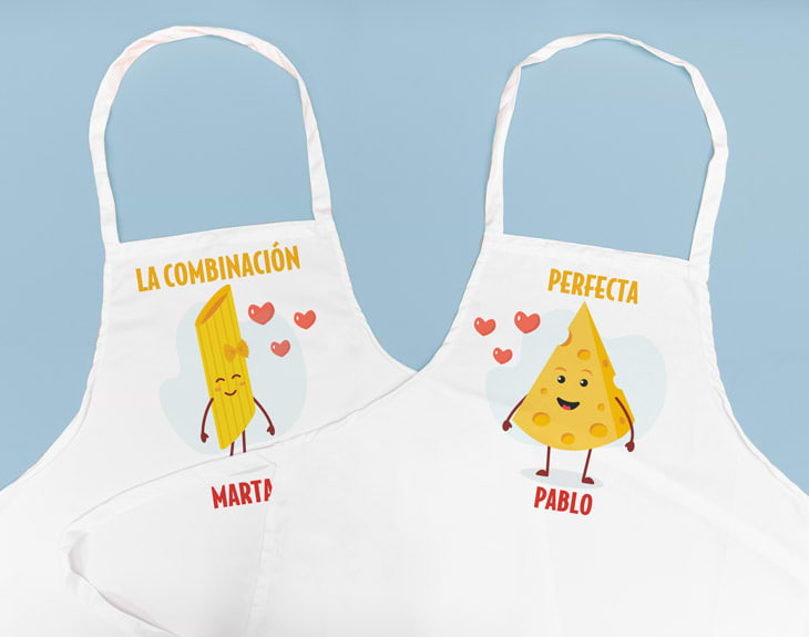 ¿Sois la combinación perfecta como pareja? ¿A ambos os encanta la pasta? Si es así, o si simplemente te enamoran los diseños monísimos como este, tenemos el complemento que no puede faltar en vuestra cocina: este par de delantales de cocina personalizados. Con ellos, esas largas tardes de postres y ollas serán mucho más divertidas. ¡No querréis parar de echaros fotos! Tanto si es para sorprender a tu pareja como para ese matrimonio de amigos tan especiales, este es un gran regalo original. Inscribe los dos nombres de la pareja, uno en cada delantal de poliéster, ¡y mira lo bonitos que quedan! ¿Quién quiere ser el macarrón y quién el queso? Seguro que, al igual que ellos, ¡vosotros también os complementáis de la mejor manera! Evita las manchas y saca a tu novio/a una sonrisa con este pack de delantales blancos de pareja. Personalízalo y sorprende a tu pareja. -Medidas aproximadas Delantal de colores: 89x65 cm Delantal blanco: 84x57 cm -Medidas aproximadas de la cinta del delantal con foto blanco: 60 cm cada tira. Material: 100% poliéster.