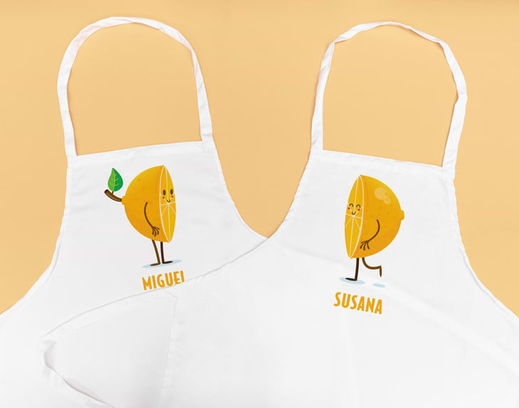 ¿Quién es tu media naranja? Si en todas las fotos se os ve super felices juntos y hacéis todo juntos, ahora podréis hacerlo de una manera diferente y mucho más divertida. ¡Vais a estar monísimos con vuestros propios delantales de cocina personalizados! Vuestras fotos con ellos serán aún más bonitas si cabe. Y todo el mundo verá por todos lados que la otra persona es tu media naranja. Para todos esos momentos especiales, este es el mejor regalo de pareja original. Además del precioso diseño, ¡podéis inscribir vuestros nombres! Personalízalo como quieras, y pasároslo genial eligiendo quién es cada media naranja. Cada vez que estéis juntos, no os podrán faltar. Y cuando estéis separados, podéis tener cada uno el del otro y sentiros más cerca que nunca. Dale un toque de luz a cada comida con el que a partir de ahora será tu complemento favorito de cocina. Añade este pack de delantales blancos de pareja al carrito y mira en la previsualización lo chulos que quedan vuestros nombres como si fueran naranjas. ¡Así de monos estaréis con ellos puestos! -Medidas aproximadas Delantal de colores: 89x65 cm Delantal blanco: 84x57 cm -Medidas aproximadas de la cinta del delantal con foto blanco: 60 cm cada tira. Material: 100% poliéster.