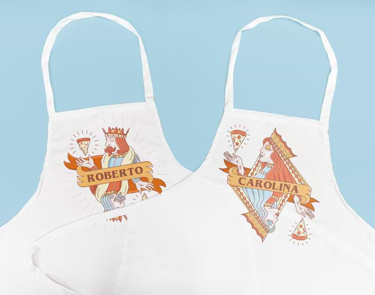 ¿Cuáles son esas cosas que os unen como pareja? ¿Qué os gusta a los dos? Ese tipo de películas, ese sitio para comer, esa receta que os sale tan bien... Si la pizza es uno de los ingredientes fundamentales de vuestras citas, ¡no os pueden faltar vuestros propios delantales de cocina personalizados! Decid con orgullo que sois los reyes de la pizza. Además de ser un detalle genial para tu pareja, también es un regalo original para cualquier amigo o familiar. Al venir en pack de 2, puedes compartirlo con la persona que más conexión tengas. ¿Tu compañero de piso con el que siempre cocinas? ¿Tu hermano/a que, siempre que os juntáis, os liais en la cocina? Sea para quién sea, puedes elegir la combinación que quieras en el diseño: dos mujeres, dos hombres o mujer y hombre. Da un paso más en vuestra relación tan única con estos divertidos y característicos pack de delantales blancos de pareja. ¡Podrás grabar vuestros nombres sobre ellos! Añade el producto al carrito y mira lo chulos que quedan, sea el nombre que sea. -Medidas aproximadas Delantal de colores: 89x65 cm Delantal blanco: 84x57 cm -Medidas aproximadas de la cinta del delantal con foto blanco: 60 cm cada tira. Material: 100% poliéster.