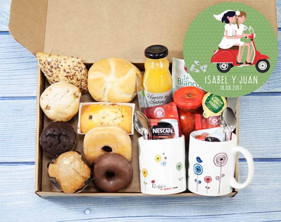 Contenido para 1 persona: • Caja (personalizada o sin personalizar). • Taza. • Manzana roja. • Café. • Té de varios sabores. • Rooibos. • Zumo ecológico (Huerto de Sabor). • Bollería Artesanal: -Coulant de chocolate (artesanal). -Muffins con pepitas. (artesanal). -Donuts (Pan Rico). -Pump cake (artesanal) -Mini Donuts (Pan Rico). • Servilleta. • Tarjeta Recordatoria. Contenido para 2 personas: • Caja (personalizada o sin personalizar). • 2 Tazas. • 2 Cafés. • Té de varios sabores. • 2 Rooibos. • 2 Zumos ecológico (Huerto de Sabor). • Bollería Artesanal: -Coulant de chocolate (artesanal). -Muffins con pepitas. (artesanal). -Donuts (Pan Rico). -Pump cake (artesanal) -Mini Donuts (Pan Rico). • Panes artesanales: - Pan chapata - Pan de cristal. - Pan brioche. • Tomate rosa de Barbastro triturado (300g). • 2 Aceites de oliva ecológicos 10 ml. • 2 cuberterías. • 2 servilletas. • Tarjeta Recordatoria. Las tazas y los termos personalizados reemplazarán a los del desayuno.