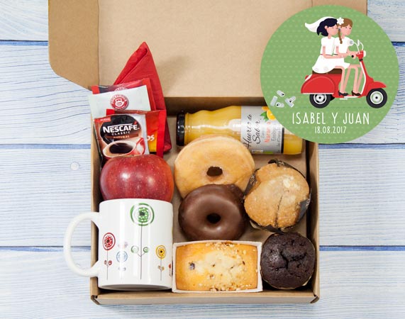 Contenido para 1 persona: • Caja (personalizada o sin personalizar). • Taza blanca (personalízala por 5€). • Manzana roja. • Café. • Té de varios sabores. • Zumo ecológico (Huerto de Sabor). • Bollería Artesanal: -Coulant de chocolate (artesanal). -Muffins con pepitas. (artesanal). -Donuts. -Mini Donuts. • Servilleta. • Tarjeta Recordatoria. Contenido para 2 personas: • Caja (personalizada o sin personalizar). • 2 Tazas blancas (personaliza cada una por 5€). • 2 Cafés. • Té de varios sabores. • 2 Zumos ecológico (Huerto de Sabor). • Bollería Artesanal: -Coulant de chocolate (artesanal). -Muffins con pepitas. (artesanal). -Donuts. -Mini Donuts. • Panes artesanales: - Pan chapata - Pan de cristal. - Pan brioche. • Tomate rosa de Barbastro triturado (300g). • 2 Aceites de oliva ecológicos 10 ml. • 2 cuberterías. • 2 servilletas. • Tarjeta Recordatoria. Las tazas y los termos personalizados reemplazarán a los del desayuno. ¿Cómo incluir los productos opcionales? Una vez hayas seleccionado el tipo de desayuno, en el apartado de adicionales (paso 2) podrás añadir todos los productos opcionales que quieras.