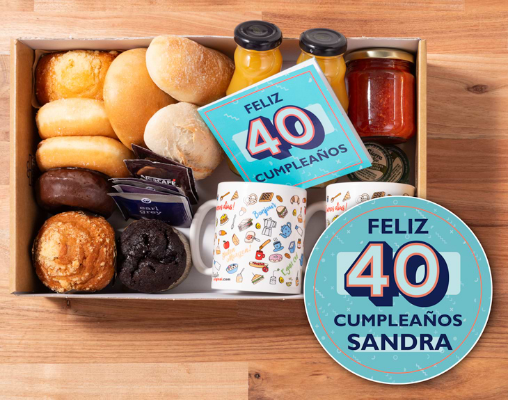 Contenido para 1 persona: • Caja (personalizada o sin personalizar). • Taza blanca (personalízala por 5€). • Manzana roja. • Café. • Té de varios sabores. • Zumo ecológico. • Bollería Artesanal: -Coulant de chocolate (artesanal). -Muffin con pepitas. (artesanal). -Donuts. -Mini Donuts. • Libro "Feliz 40 cumpleaños" (52 páginas). • Servilleta. • Tarjeta Recordatoria. Contenido para 2 personas: • Caja (personalizada o sin personalizar). • 2 Tazas blancas (personaliza cada una por 5€).´ • 2 Cafés. • Té de varios sabores. • 2 Zumos ecológico (Huerto de Sabor). • Bollería Artesanal: -Coulant de chocolate (artesanal). -Muffin con pepitas. (artesanal). -Donuts. -Mini Donuts. • Panes artesanales: - Pan chapata - Pan de cristal. - Pan brioche. • Tomate rosa de Barbastro triturado (300g). • 2 Aceites de oliva ecológicos 10 ml. • 2 servilletas. • Libro "Feliz 40 cumpleaños" (52 páginas). • Tarjeta Recordatoria. Las tazas y los termos personalizados reemplazarán a los del desayuno. ¿Cómo incluir los productos opcionales? Una vez hayas seleccionado el tipo de desayuno, en el apartado de adicionales (paso 2) podrás añadir todos los productos opcionales que quieras.