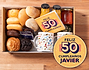 Contenido para 1 persona: • Caja (personalizada o sin personalizar). • Taza blanca (personalízala por 5€). • Manzana roja (opcional). • Café. • Té de varios sabores. • Zumo ecológico. • Bollería Artesanal: -Coulant de chocolate (artesanal). -Muffins con pepitas. (artesanal). -Donuts. -Mini Donuts. • Libro "Feliz 50 cumpleaños" (52 páginas). • Servilleta. • Tarjeta Recordatoria. Contenido para 2 personas: • Caja (personalizada o sin personalizar). • 2 Tazas blancas (personaliza cada una por 5€). • 2 Cafés. • Té de varios sabores. • 2 Zumos ecológico (Huerto de Sabor). • Bollería Artesanal: -Coulant de chocolate (artesanal). -Muffins con pepitas. (artesanal). -Donuts. -Mini Donuts. • Panes artesanales: - Pan chapata - Pan de cristal. - Pan brioche. • Tomate rosa de Barbastro triturado (300g). • 2 Aceites de oliva ecológicos 10 ml. • 2 cuberterías. • 2 servilletas. • Libro "Feliz 50 cumpleaños" (52 páginas). • Tarjeta Recordatoria. Las tazas y los termos personalizados reemplazarán a los del desayuno. ¿Cómo incluir los productos opcionales? Una vez hayas seleccionado el tipo de desayuno, en el apartado de adicionales (paso 2) podrás añadir todos los productos opcionales que quieras.