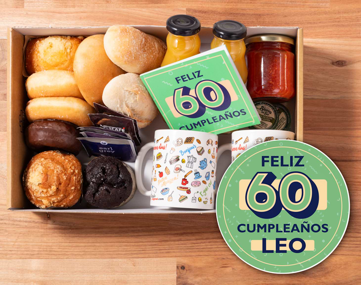Contenido para 1 persona: • Caja (personalizada o sin personalizar). • Taza blanca (personalízala por 5€). • Manzana roja. • Café. • Té de varios sabores. • Zumo ecológico. • Bollería Artesanal: -Coulant de chocolate (artesanal). -Muffins con pepitas. (artesanal). -Donuts. -Mini Donuts. • Libro "Feliz 60 cumpleaños" (52 páginas). • Servilleta. • Tarjeta Recordatoria. Contenido para 2 personas: • Caja (personalizada o sin personalizar). • 2 Tazas blancas (personaliza cada una por 5€). • 2 Cafés. • Té de varios sabores. • 2 Zumos ecológico (Huerto de Sabor). • Bollería Artesanal: -Coulant de chocolate (artesanal). -Muffins con pepitas. (artesanal). -Donuts. -Mini Donuts. • Panes artesanales: - Pan chapata - Pan de cristal. - Pan brioche. • Tomate rosa de Barbastro triturado (300g). • 2 Aceites de oliva ecológicos 10 ml. • 2 cuberterías. • 2 servilletas. • Libro "Feliz 60 cumpleaños" (52 páginas). • Tarjeta Recordatoria. Las tazas y los termos personalizados reemplazarán a los del desayuno. ¿Cómo incluir los productos opcionales? Una vez hayas seleccionado el tipo de desayuno, en el apartado de adicionales (paso 2) podrás añadir todos los productos opcionales que quieras.