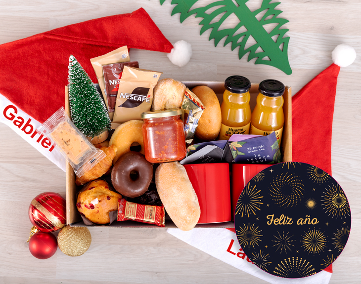 Contenido para 1 persona: • Caja. • Árbol de navidad. • Gorro navideño (personalización opcional). • Turroncito de almendra • Turroncito de almendra con cacao. • Porción de turrón blando. • Taza de diseño. • Manzana. • Café. • Té de varios sabores. • Rooibos. • Zumo ecológico (Huerto de Sabor). • Bollería Artesanal: -Coulant de chocolate (artesanal). -Muffins con pepitas. (artesanal). -Donuts (Pan Rico). -Pump cake (artesanal) -Mini Donuts (Pan Rico). • Servilleta. • Tarjeta Recordatoria. Contenido para 2 personas: • Caja. • Árbol de navidad. • 2 Gorros navideños (personalización opcional). • 2 Figuras de mazapán. • 2 Turroncitos de almendra • 2 Turroncitos de almendra con cacao. • 2 Porciones de turrón blando. • 2 Tazas de diseño. • 2 Cafés. • Té de varios sabores. • 2 Rooibos. • 2 Zumos ecológico (Huerto de Sabor). • Bollería Artesanal: -Coulant de chocolate (artesanal). -Muffins con pepitas. (artesanal). -Donuts (Pan Rico). -Pump cake (artesanal) -Mini Donuts (Pan Rico). • Panes artesanales: - Pan chapata - Pan de cristal. - Pan brioche. • Tomate rosa de Barbastro triturado (300g). • 2 Aceites de oliva ecológicos 10 ml. • 2 cuberterías. • 2 servilletas. • Tarjeta Recordatoria. Las tazas y los termos personalizados reemplazarán a los del desayuno.