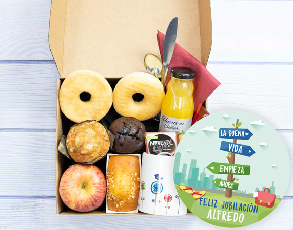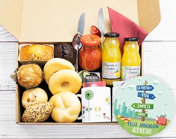 Contenido para 1 persona: • Caja (personalizada o sin personalizar). • Taza blanca (personalízala por 5€). • Manzana roja. • Café. • Té de varios sabores. • Zumo ecológico (Huerto de Sabor). • Bollería Artesanal: -Coulant de chocolate (artesanal). -Muffins con pepitas. (artesanal). -Donuts. -Mini Donuts. • Servilleta. • Tarjeta Recordatoria. Contenido para 2 personas: • Caja (personalizada o sin personalizar). • 2 Tazas blancas (personaliza cada una por 5€). • 2 Cafés. • Té de varios sabores. • 2 Zumos ecológico (Huerto de Sabor). • Bollería Artesanal: -Coulant de chocolate (artesanal). -Muffins con pepitas. (artesanal). -Donuts. -Mini Donuts. • Panes artesanales: - Pan chapata - Pan de cristal. - Pan brioche. • Tomate rosa de Barbastro triturado (300g). • 2 Aceites de oliva ecológicos 10 ml. • 2 cuberterías. • 2 servilletas. • Tarjeta Recordatoria. Las tazas y los termos personalizados reemplazarán a los del desayuno. ¿Cómo incluir los productos opcionales? Una vez hayas seleccionado el tipo de desayuno, en el apartado de adicionales (paso 2) podrás añadir todos los productos opcionales que quieras.